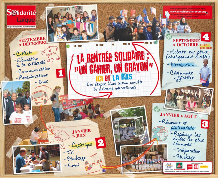L’objectif premier de l’opération « Un cahier, un crayon » est d’améliorer les conditions de scolarisation des enfants et des écolière(e)s, des jeunes, dans le système formel (écoles, collège, en apprentissage) ou dans les structures d’éducation informelle (clos d’enfants, crèches, écoles communautaires…) en fournissant le matériel de base pour étudier : les fournitures scolaires.